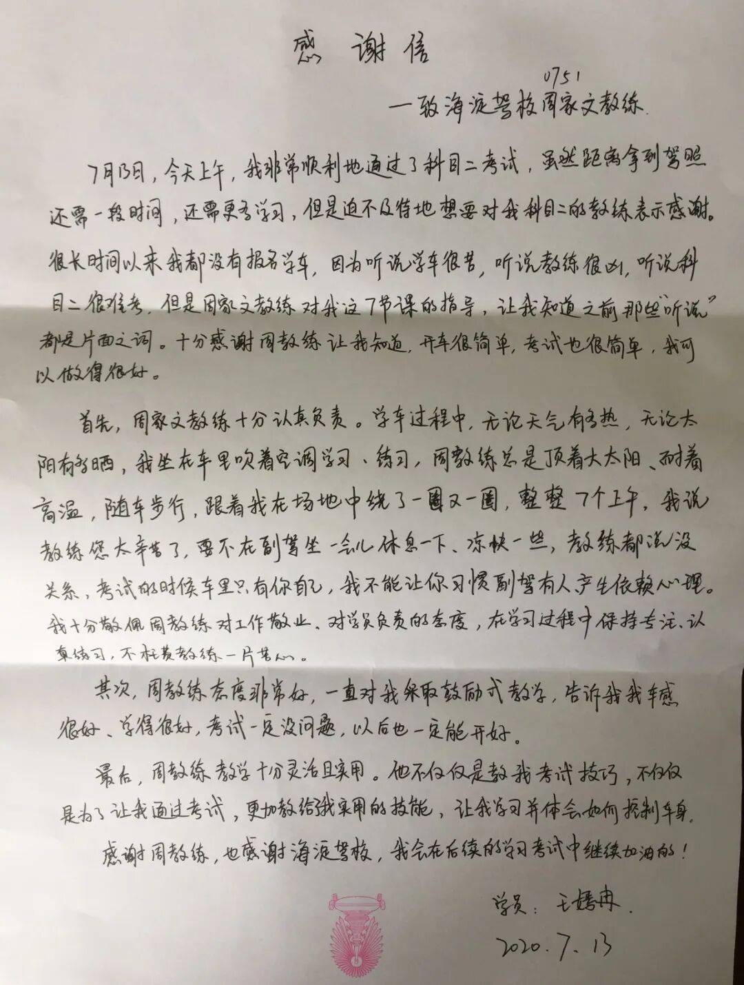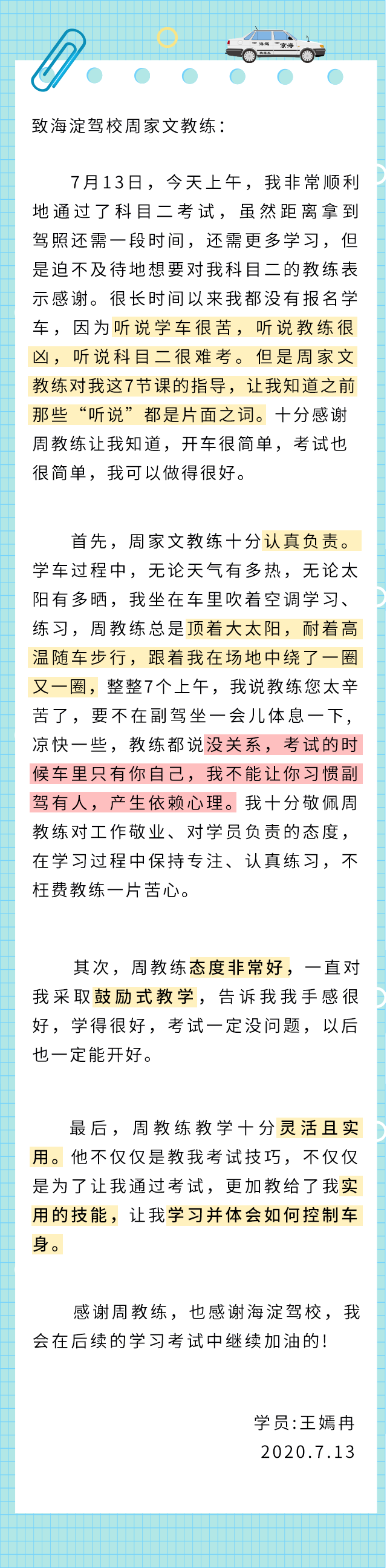 对于海驾来说,既是感谢信,也是鼓励和鞭策,未来,海淀驾校将进一步强化内部管理,提升培训水平,为学员提供更好的服务,让学员都满意地从海淀驾校毕业。