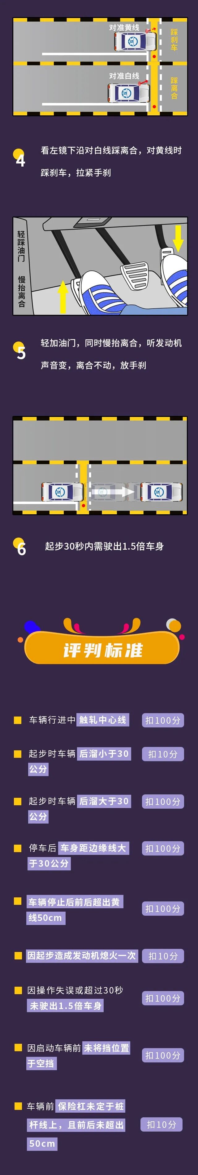 其实只是有些需要注意的细节 被你忽略了 比如这些 ▼ 1、上坡前应在最短时间内把方向调正。 2、在上坡时候应向场地右侧靠,使车右侧与道路右边一条实线平行,车身侧面与该实线距离不得超过30厘米,且不能轧到实线。 3、注意离合器、加速踏板和驻车制动杆(手刹杆)的协调配合,放松驻车制动杆(手刹杆)的时机。