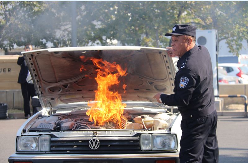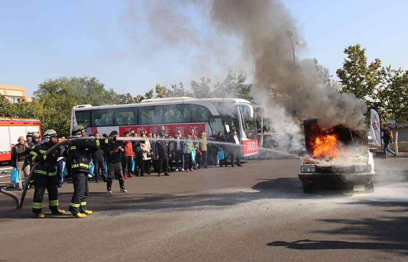 此外,柳实教授在现场还亲身为大家演示了私家车涉水时破窗自救方法及不同起火状况下的应急自救操作和消防队的救援演示。