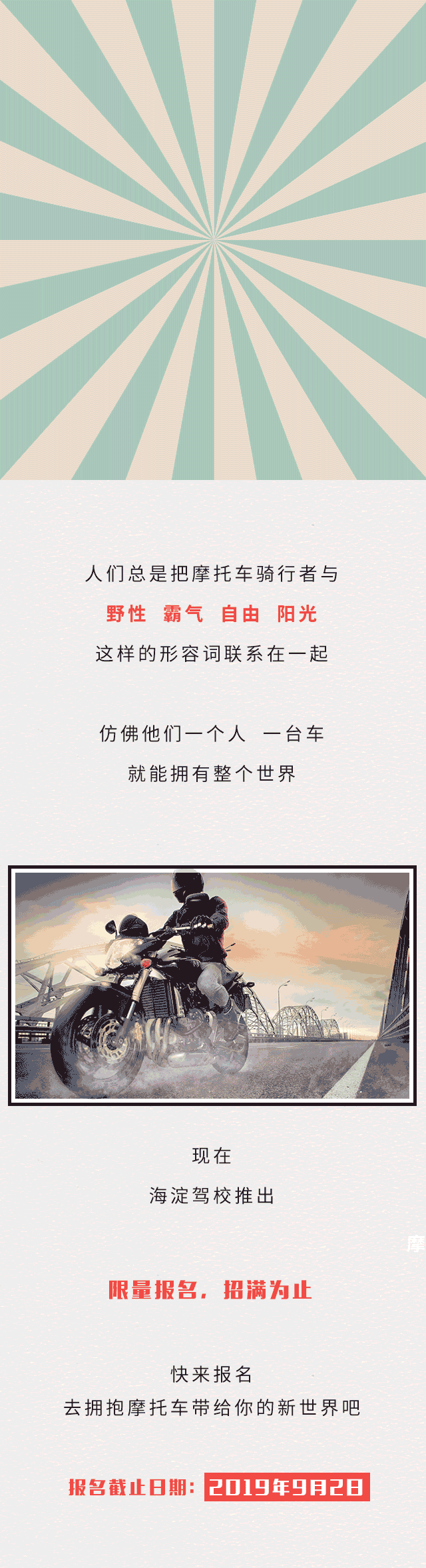 ![]() ![]() 09:00-10:00 会议签到 10:00-12:00 试骑试驾品鉴 12:00-13:00 午餐休息娱乐 13:00-15:30 正式会议 ![]() ![]() ![]() ![]() 虽然“跨界联盟大会” 只会持续短短的几个小时 但是摩托车带给人们的激情 不会消退 ![]()