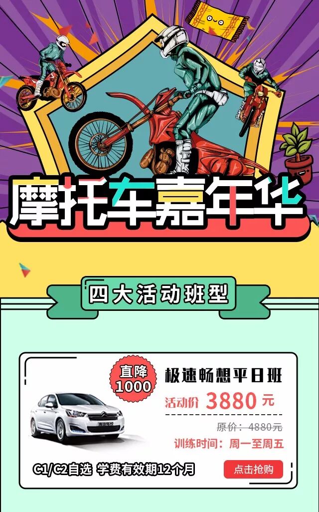 今年 我们的摩托车嘉年华项目 只多不少 保证让大家玩的够high 同时 海淀驾校将进行嘉年华钜惠活动 四大班型疯狂降价 总有一款适合你 ![]()