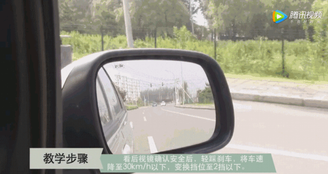 看后视镜确认安全后,轻踩刹车 将车速降至30km/h以下 变换挡位至2挡以下