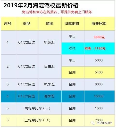 本价格为全年最低价 找刁教练报名,再为您带来科目二三免费补考福利 周末班5180 免约车( 原价5880) 平时班3880 免约车( 原价4880) 平时班1年有效期,如果过期没有取得驾照,要补差价到原价。 周末班3年有效期,逾期作废。 为了提高学习效率,以上班型要求: 俩人一车,或服从驾校安排练车,或自主APP约车 学时安排及次数: 科目一:网络学习,到校考试(1次) 科目二:俩人一车,早8点练到晚8点 ,4天练完(4次)+考试(1次) 科目三:一人一车,3个半天 (3次)+考试(1次) 科目四,网络学习,到校考试(1次) 只作为参考,驾校会根据实际人数等情况随时更改