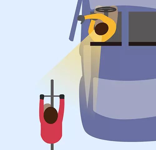 (“荷氏开门法”示意图) 按照平时的驾驶习惯, 我们把车停到路边准备下车前, 会先通过驾驶室一侧的后视镜观察, 确认后方没有行人和车辆时, 再把门打开一条缝隙观察, 然后完全打开车门。