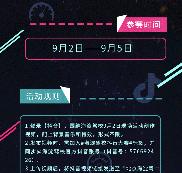 so,不要再犹豫了 快来参加海淀驾校抖音视频创意大赛 不论你是抖音达人、运镜高手、还是抖音小白, 只要你有激情、有创意、够活力, 都可以参加本次比赛!