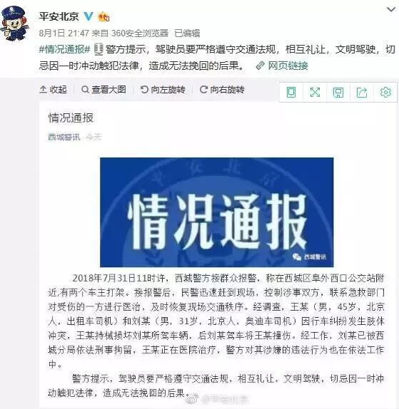8月1日,北京市公安局官方微博通报,奥迪车主被西城分局依法刑事拘留,出租车司机在医院治疗,警方对其涉嫌的违法行为也在依法工作中。