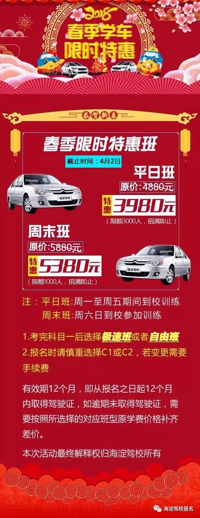 最后,你需要准备好足够的费用(土豪请忽略) 学车费用肯定越低越好,但一定要保证质量。 说到这里就不得不再说一下咱们海淀驾校最近推出的最新【春季学车优惠班型】(←点击查看),最高直降900元!价格更低,服务更好!考试顺利直接拿证,中间不多花一分钱(考场训练自选)。