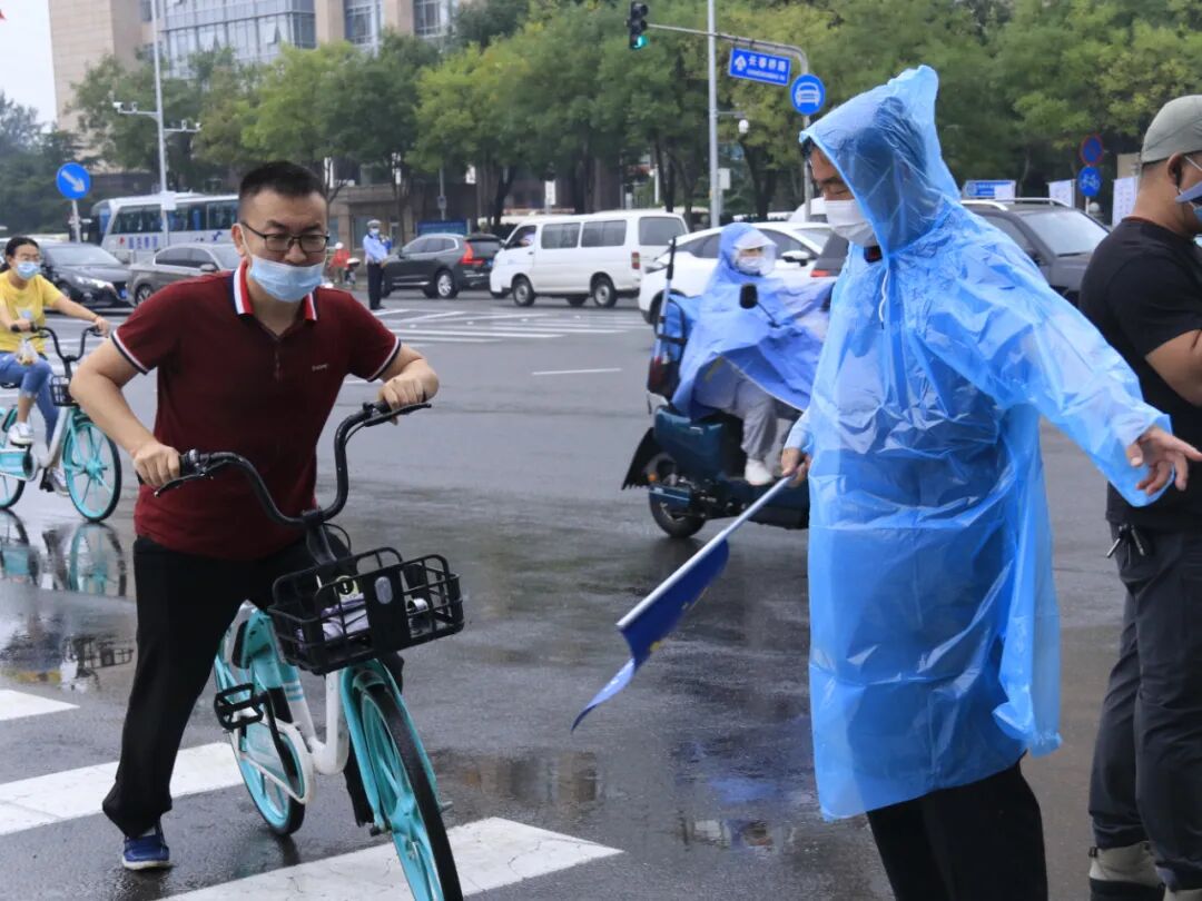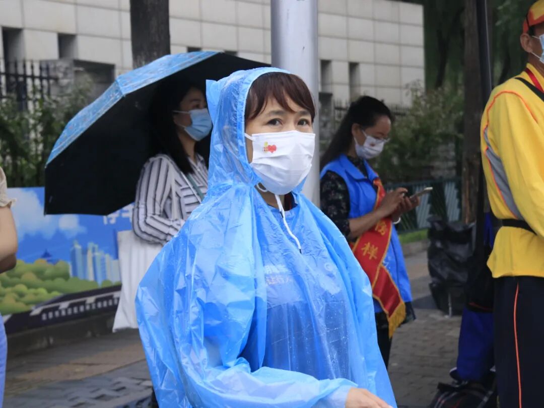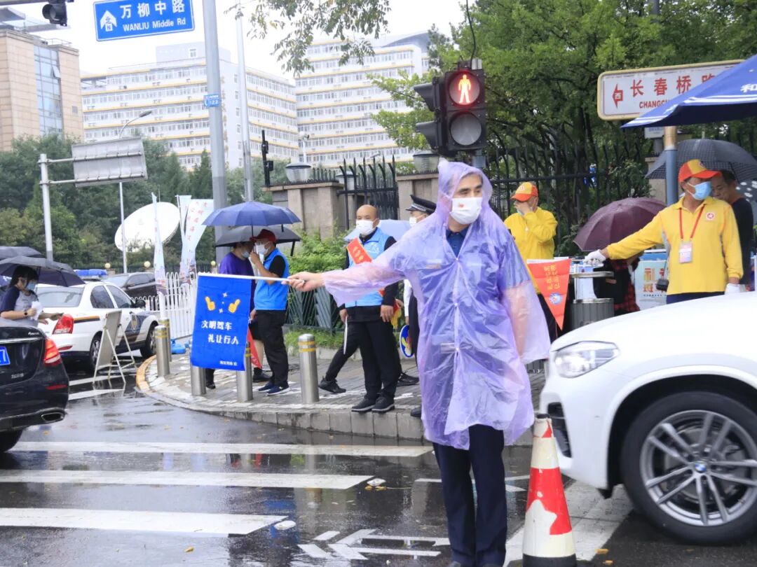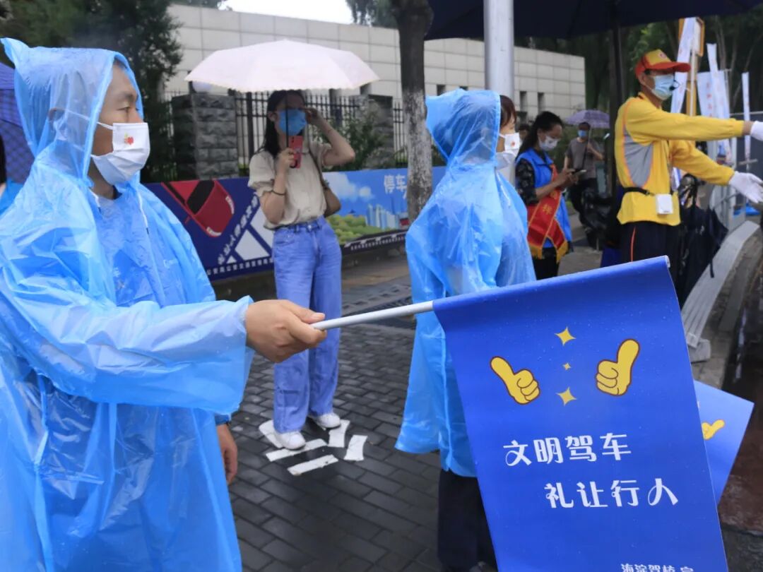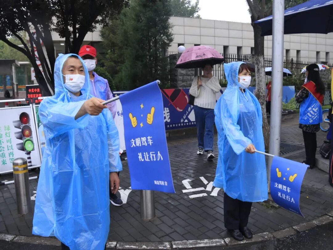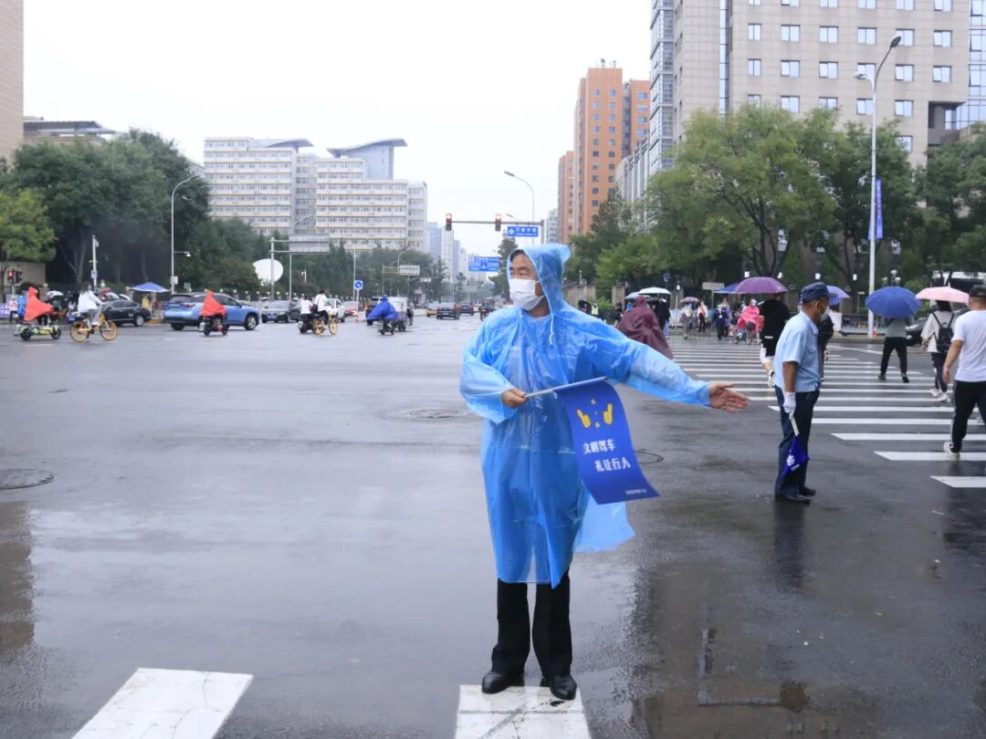 海淀驾校副校长刘山宏(右四),全国十大交通运输风范人物刘全杰(右三),海淀驾校连续多年的教学服务标兵赵淑梅(左三),海淀驾校优秀员工、苏家坨镇演讲比赛获奖者李艳军(右二)、白秀红(左二)等 上午7:00早高峰,天空下起了蒙蒙细雨,地面湿滑、行人匆匆,无论开车、骑车还是步行,都要更加谨慎。海淀驾校先进员工代表在副校长徐小灵、刘山宏的带领下,到万柳中路、长春桥路等人群密集路口疏导交通、维护交通秩序。 礼让斑马线 海驾在行动