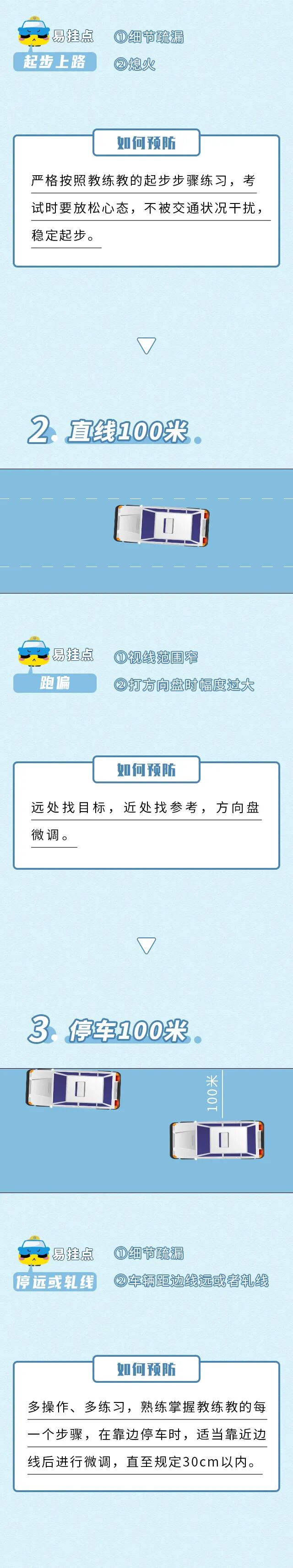 在科目三路考中 除了上述内容中说到的3个“挂科100米” 还有一些细节一定要注意到 注意事项 保持距离 在实际的考试中注意与社会车辆的距离把控,千万不要挨的太近,以免社会车发生什么事情,导致自己直接挂科! 转过弯后方向立马调正 有的地方考直线是在转弯后进行,这时一定要放慢自己的车速,转过弯后方向一定要一把拉正不能斜,车子一旦歪了进入项目后就有挂科的危险了。 科目二难在点位,科目三难在细节 在科目三考试中 牢记细节、理解考试规则更为重要 只要记住这些细节 再调整好心态 科三妥妥过