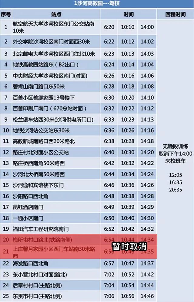 3、班车线路沙河线取消梅所屯村口路北(铁路南侧)、上庄馨月家园小区西门车站南30米路西。乘车人员可以选择海发路口西北角站点乘车。