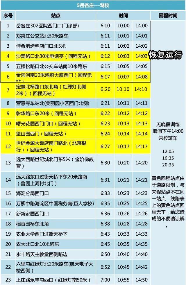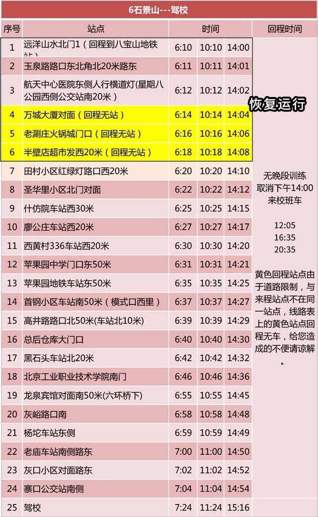 结合北京市疫情发展动态和海驾班车线路的运行情况,从2020年7月6日起,海驾班车调整如下: 1、由海驾发出的回程班车时间调整为 12:05、 16:35,晚段回程20:35。 2、永定路街道评定为中级风险区,海驾班车线路岳各庄线及石景山线恢复临时取消的站点。